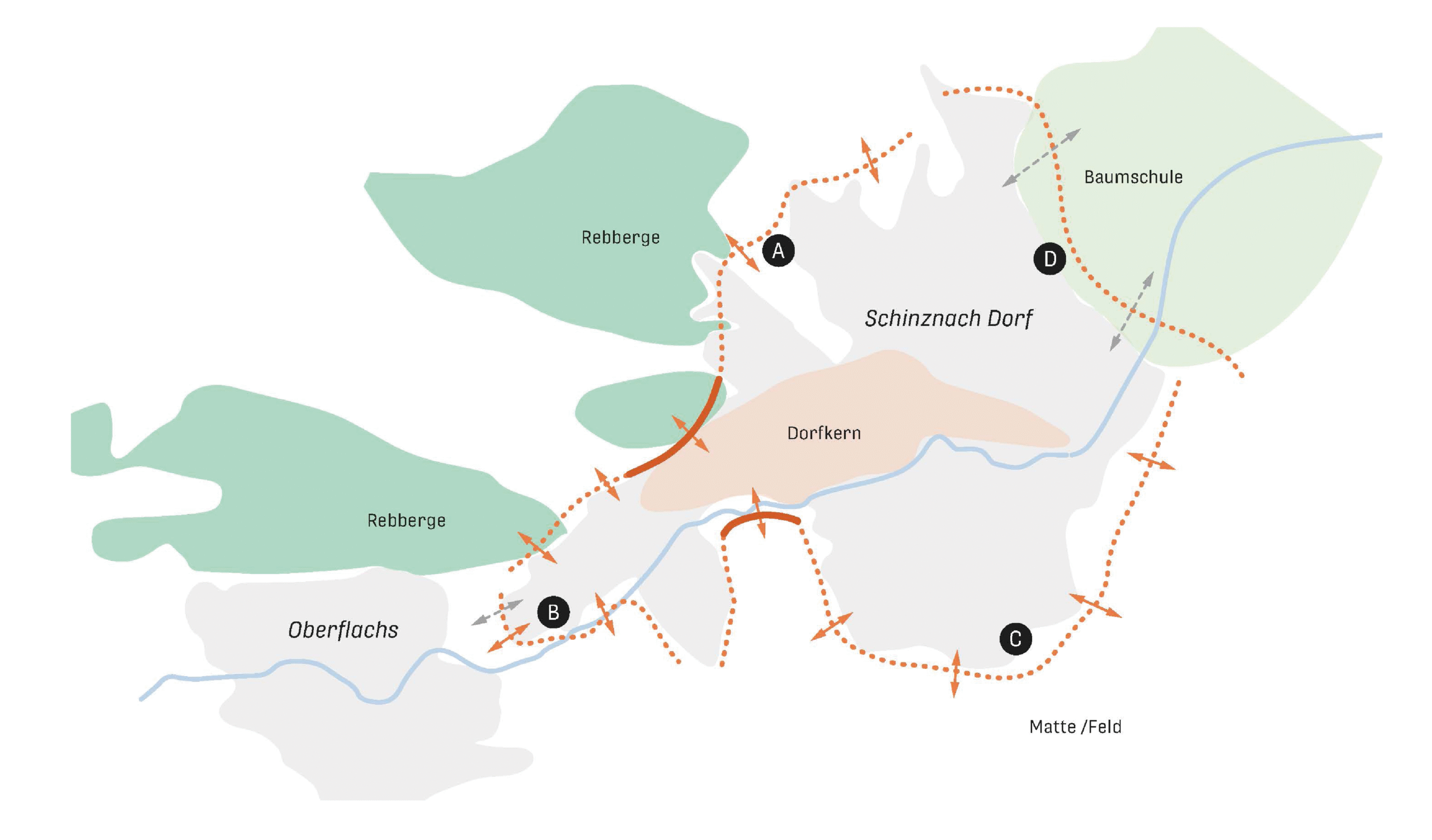Der Masterplan Dorfkern betrachtet hauptsächlich den Ortsteil Schinznach Dorf der Gemeinde Schinznach. Des weiteren sind aber auch allgemeingültige Themen in den Kapiteln „Grundsätze für Bauen und Freiraum“ und „Baukultur und Planungsprozess“ formuliert, welche zudem für den Dorfkern von Oberflachs und das gesamte Siedlungsbild angewandt werden können.