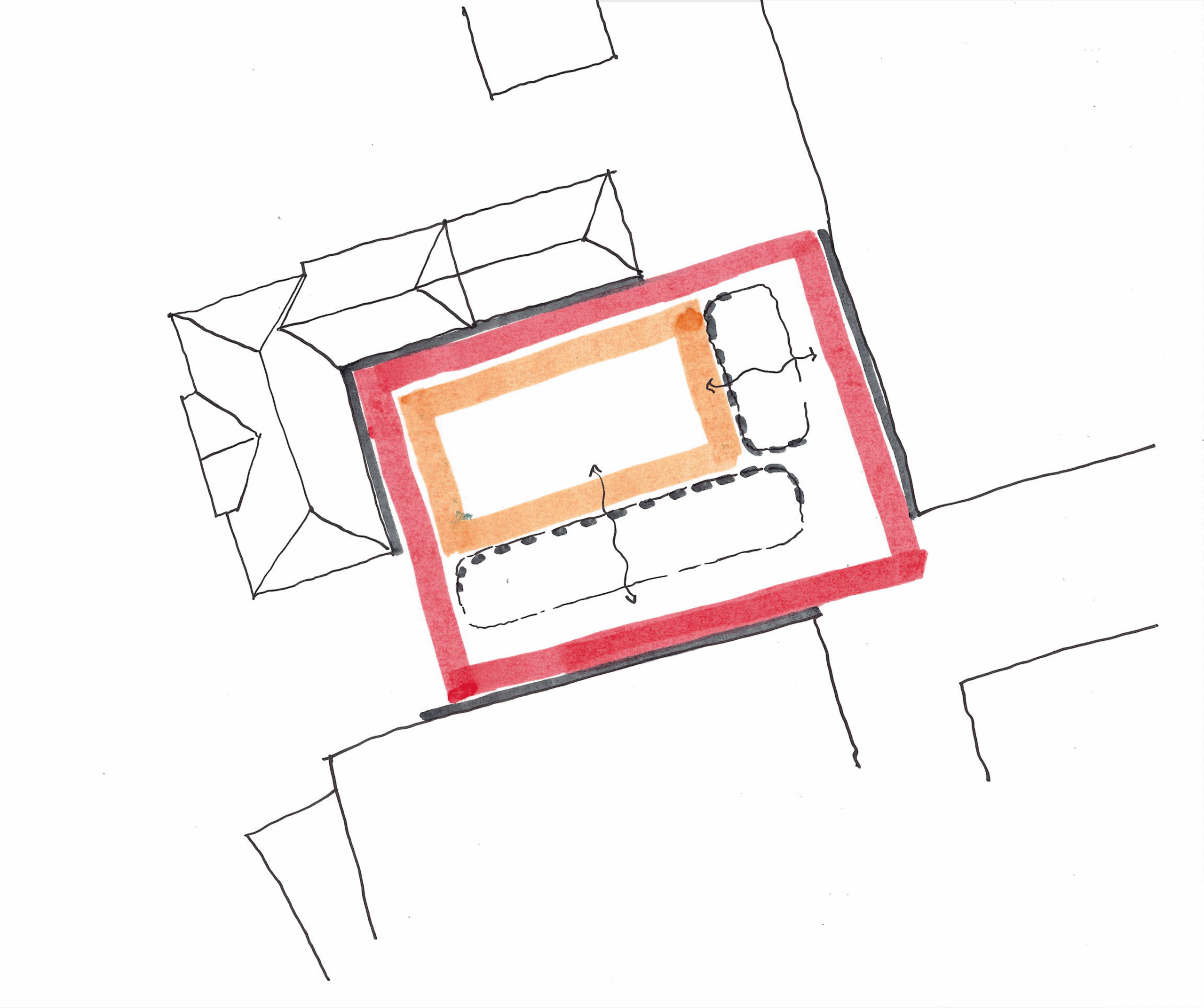 Der heute unattraktive rückwärtige Bereich des Verwaltungsgebäudes kann durch einen Neubau ortsbaulich geklärt und aufgewertet werden. Das neue Volumen ordnet sich in die Orthogonalität der Spinnereigebäude ein und nimmt auf die Abmessungen des Verwaltungsgebäudes Bezug. Das so entstehende Ensemble schafft ein starkes räumliches und architektonisches Zusammenspiel zwischen Alt und Neu und einen attraktiven gemeinschaftlichen Hof.