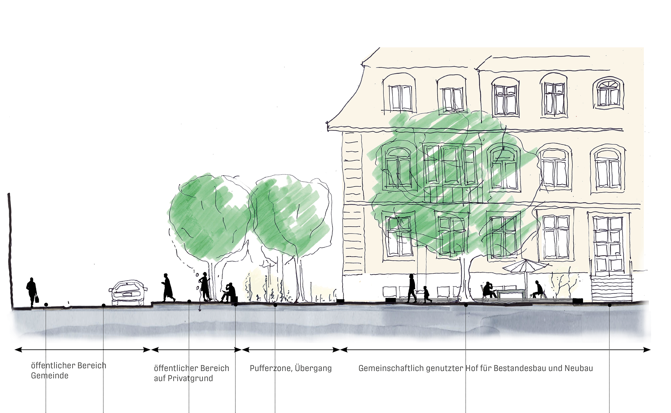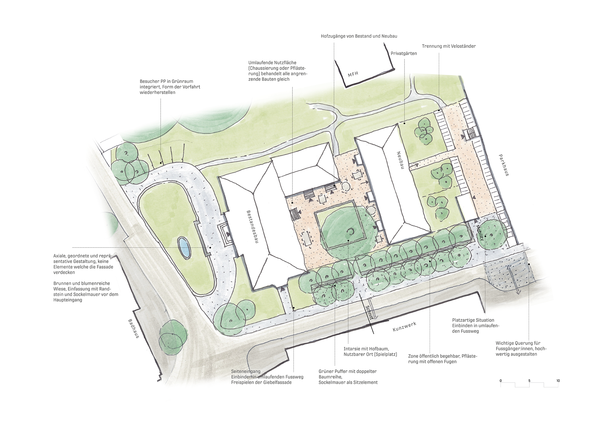 Die Pufferzone zwischen öffentlichem Raum und privatem Hof ist wichtiges räumliches und funktionales Element der Umgebungsgestaltung. Mit unterschiedlich hohen Elementen wie Bäume, Büschen, Stauden und Sockelmauern soll ein Übergang zwischen öffentlichem und privatem Raum geschaffen werden.